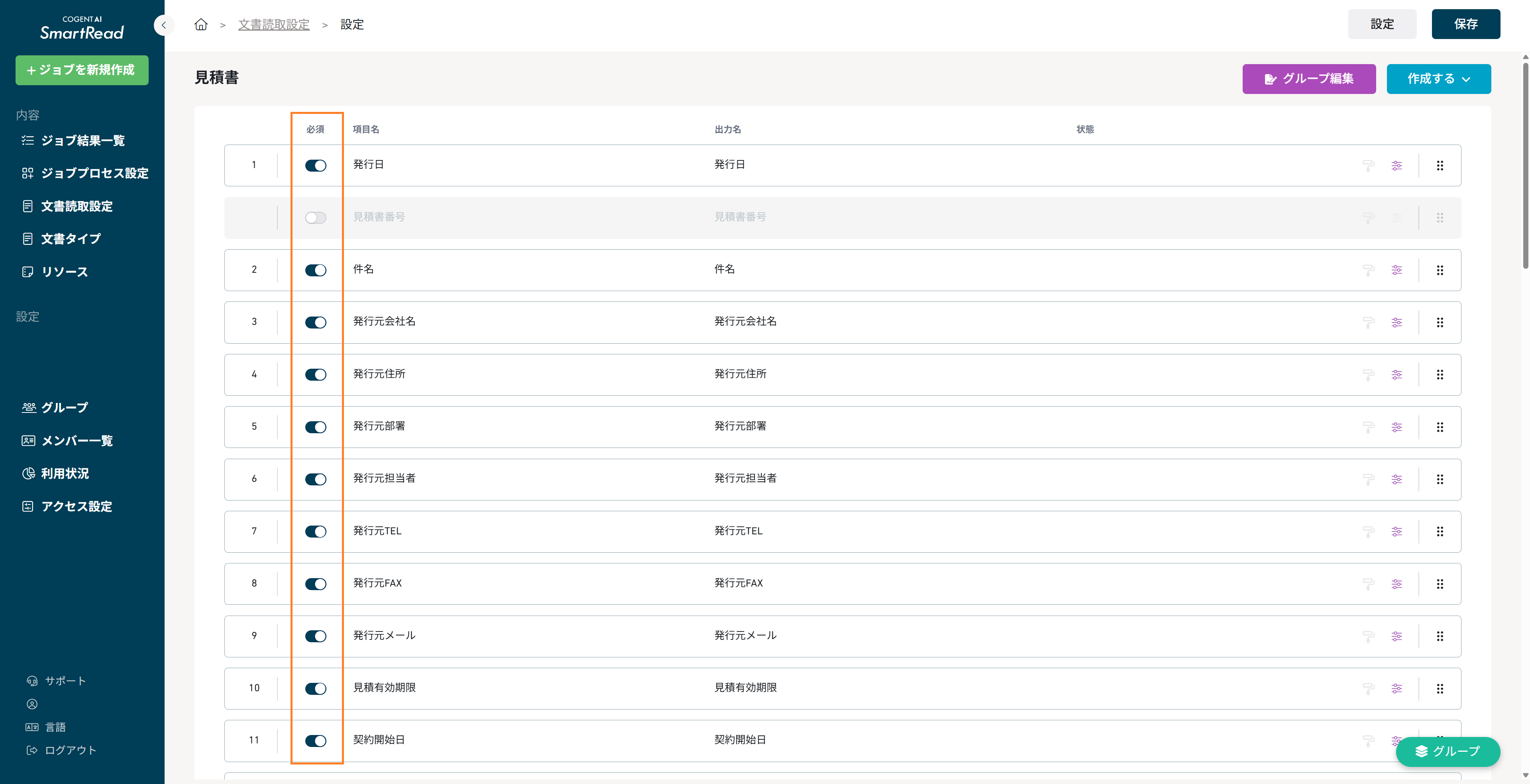 読取項目タブで読み取りたい項目の選択が可能です。選択は、[必須] ボタンで行います。 読取が不要な項目があれば未選択にしてください。