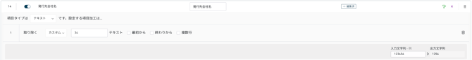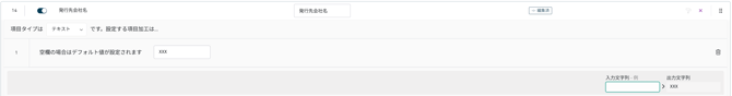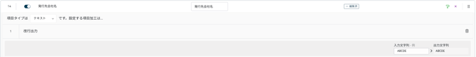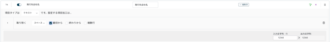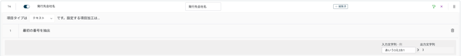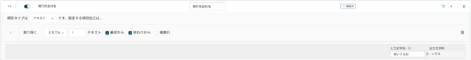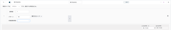 上図では、対象読取項目「発行元コード」の値に「NO」が含まれる場合に、「1」を出力します。