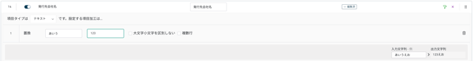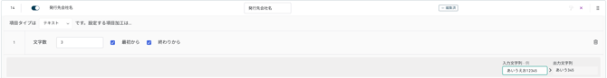 例えば、入力値「あいうえお」に対して、置換対象を「あいう」、置換する値を「123」に指定することで、出力値を「123えお」に変更できます。