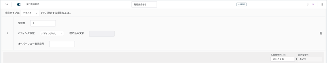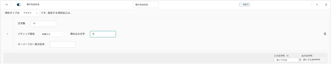 入力値の文字数が [文字数] よりも短い場合に、先頭または末尾に [埋め込み文字] を追加し、入力値の文字数と [文字数] を一致させます。