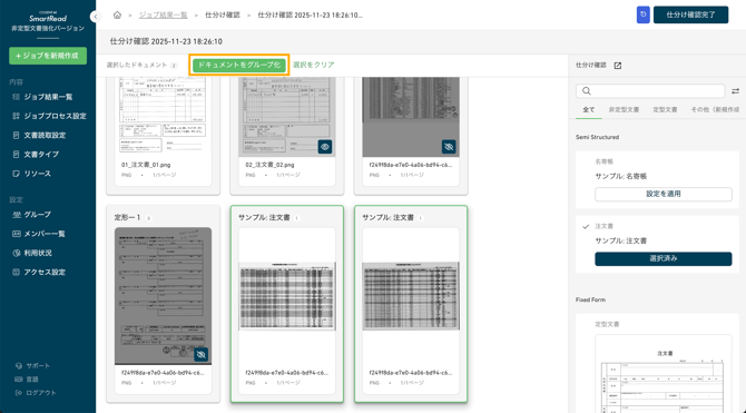 複数のページを選択し、「ドキュメントをグループ化」ボタンをクリックすることで、複数ページを1つのドキュメントとして作成できます。