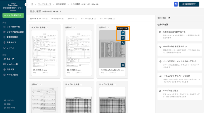 選択したページを90度単位で回転できます。回転した結果を元に読取処理が行われます。