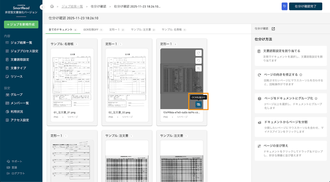 「OCR処理ON/OFF」ボタンを使用して読み取り処理の有無を選択することが可能です。読み取り不要なページがある場合は、「OCR処理OFF」ボタンをクリックすることで、該当のページを読み取り対象から除外できます。