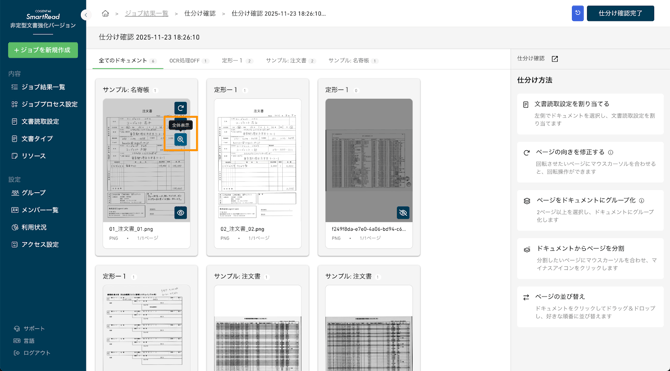 仕分け確認画面では、ユーザーは以下の複数の機能を行うことができます。